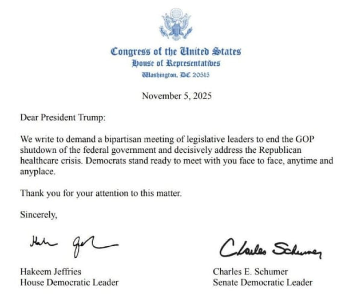 Лидеры демократов в Сенате и Палате представителей Чак Шумер и Хаким Джеффрис предложили Дональду Трампу встретиться в любом месте и в любое время, чтобы обсудить прекращение шатдауна.