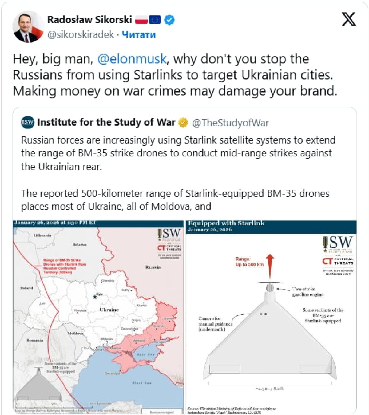 Министр иностранных дел Польши Радослав Сикорский призвал Илона Маска обратить внимание на нарастающую практику использования терминалов Starlink в российских БПЛА, атакующих Украину.