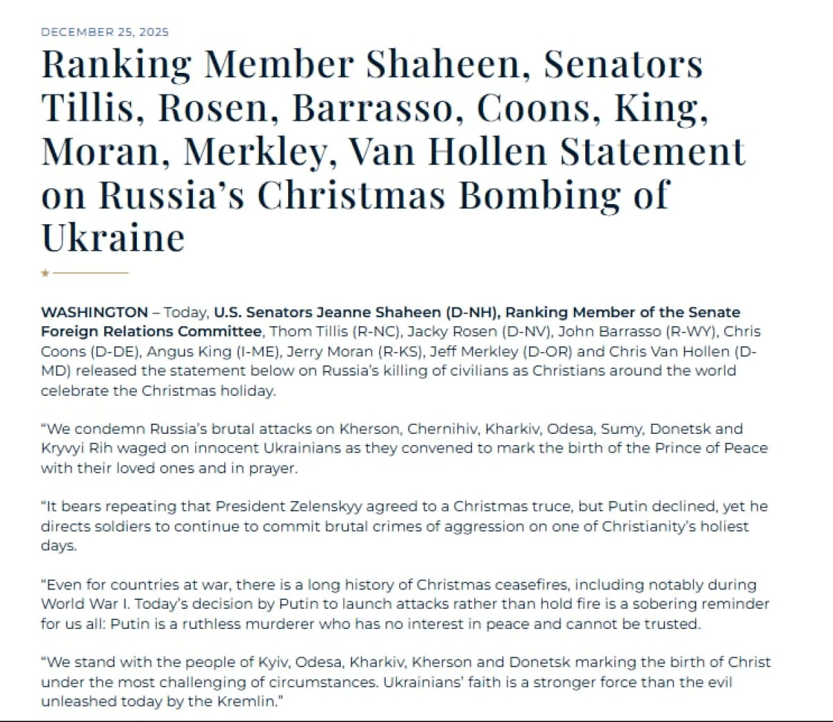 "Президент Владимир Зеленский согласился на рождественское перемирие, в то время как путин отказался, и приказывает солдатам продолжать совершать жестокие преступления агрессии в один из самых святых дней христианства. Даже для стран, находящихся в состоянии войны, существует давняя традиция рождественского перемирия, в том числе во время Первой мировой войны. Сегодняшнее решение путина начать атаки, а не прекратить огонь, является для нас всех суровым напоминанием: путин – безжалостный убийца, который не заинтересован в мире и которому нельзя доверять", – заявили сенаторы.