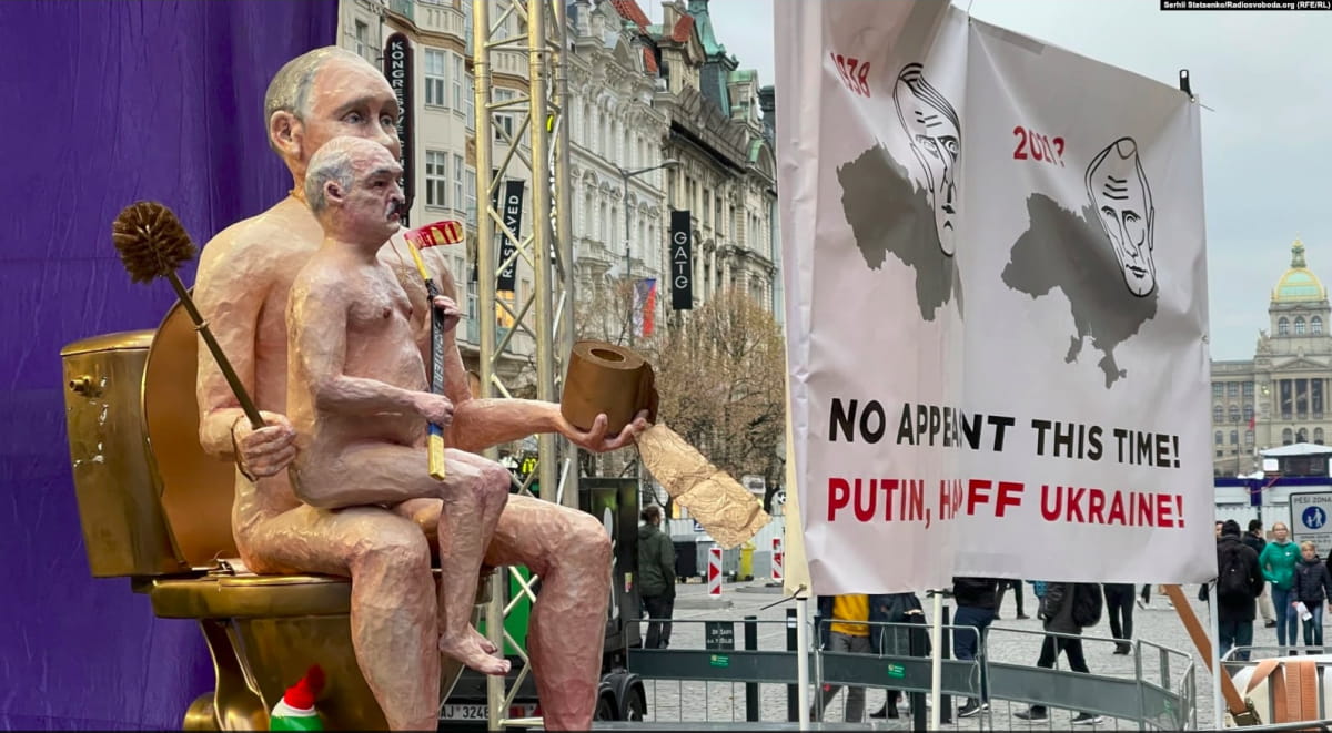 Протестная акция против диктаторских режимов лидеров России и Беларуси Владимира Путина и Александра Лукашенко состоялась в Праге во время празднования Дня борьбы за свободу и демократию 17 ноября. Участники – Группа "Капутин" – поставили на одной из центральных площадей чешской столицы "золотой" унитаз, на который посадили обнаженных кукол, похожих на руководителей России и Беларуси. Кроме того, активисты развернули плакат с надписью "Руки прочь от Украины". Об этом сообщает "Радио Свобода".