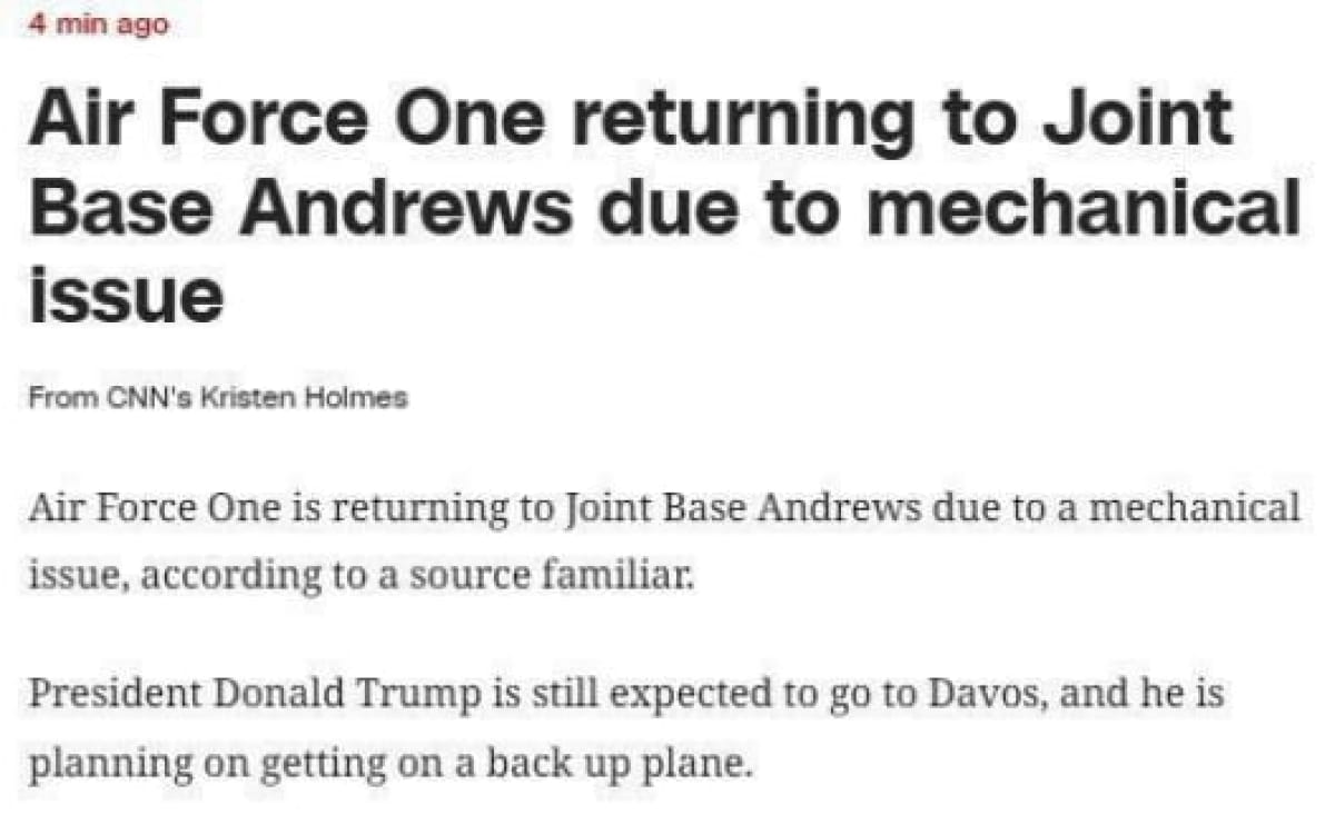 Самолет президента США Дональда Трампа, летевший на Всемирный экономический форум в Давосе, вернулся в Соединенные Штаты из-за "незначительной проблемы с электропроводкой".