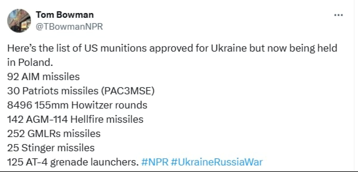 В то же время корреспондент NPR Том Боумен обнародовал перечень вооружений, которые уже находились в Польше и были готовы к отправке в Украину: