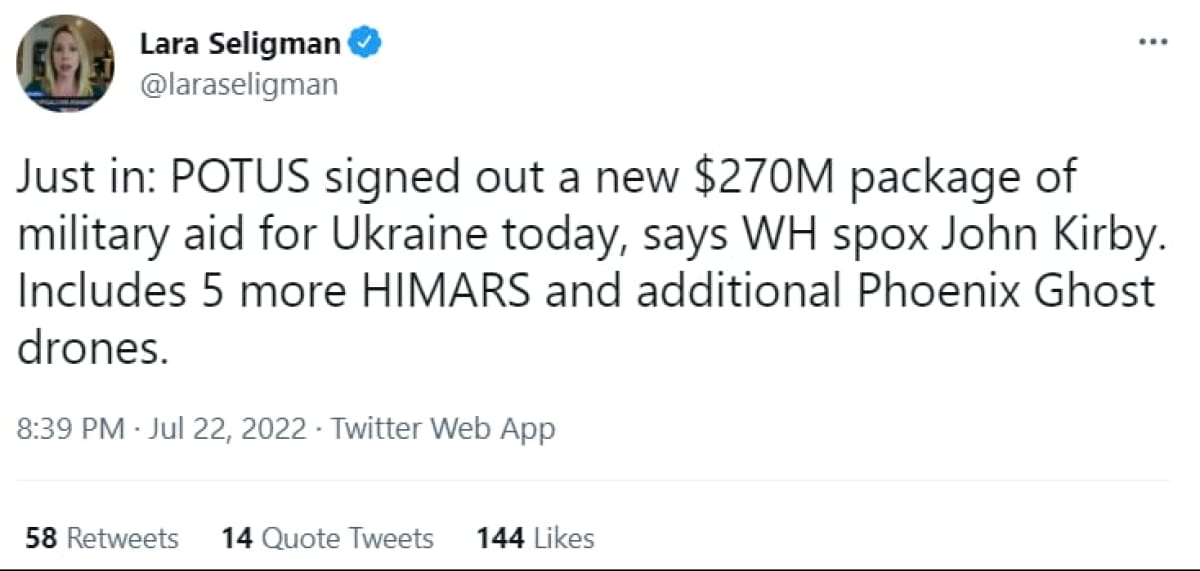 "Только что: Джо Байден подписал новый пакет военной помощи Украине на сумму $270 млн, сообщает Джон Кирби. Включает еще 5 HIMARS и дополнительные дроны Phoenix Ghost", – написала она.