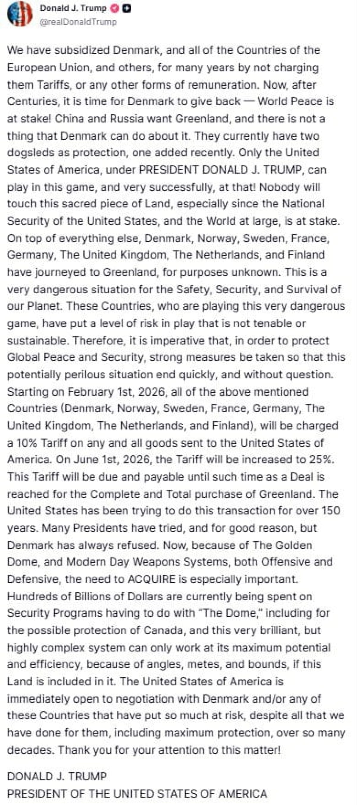 Президент США объявил о введении 10% пошлин для стран, выступающих против планов Вашингтона в отношении Гренландии. Ограничения начнут действовать с 1 февраля и коснутся всех товаров, поставляемых в Соединенные Штаты из ряда европейских государств.
