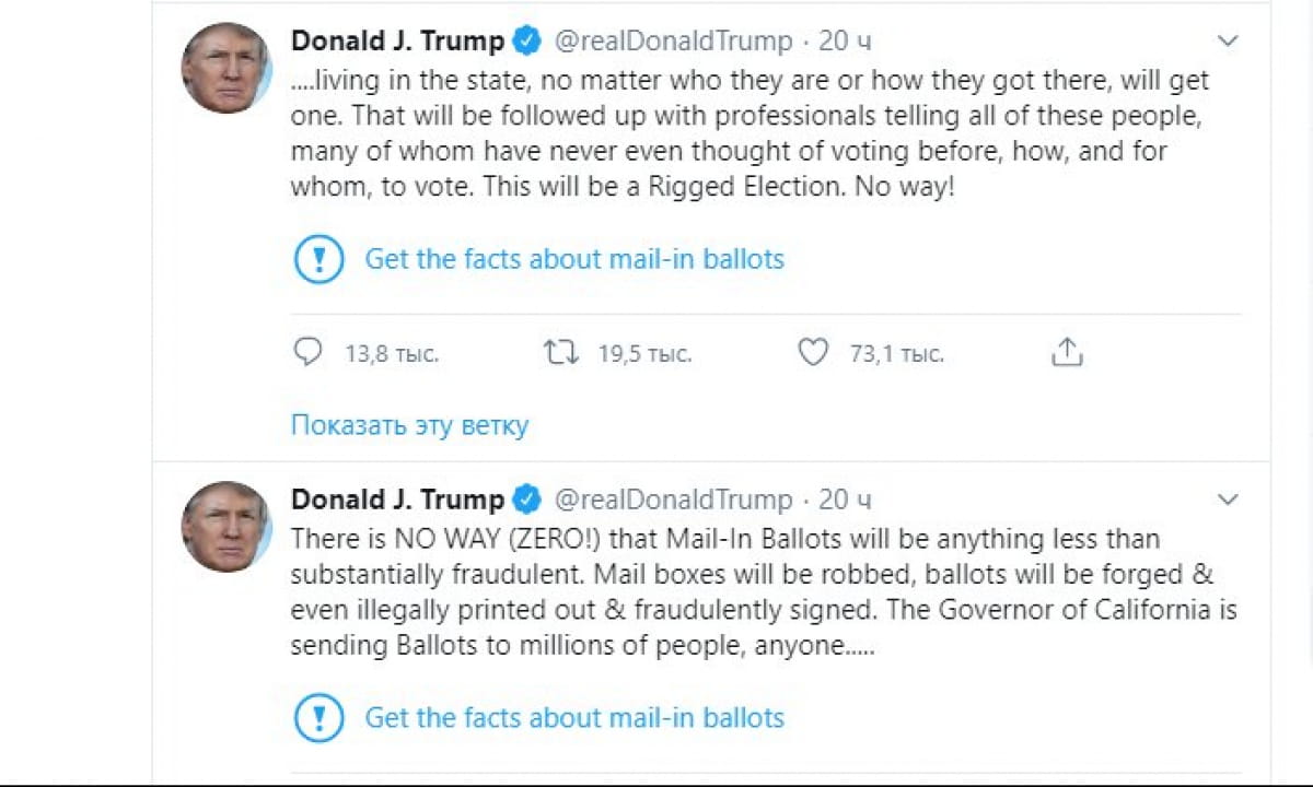Twitter отметил как недостоверные эти два поста Трампа и призвал пользователей узнать больше информации о голосовании на дому.