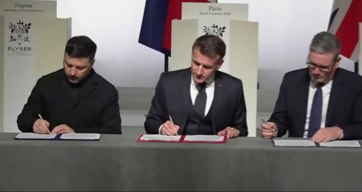 "Декларацию о намерениях между Украиной, Французской Республикой и Соединенным Королевством Великобритании и Северной Ирландии по развертыванию многонациональных сил в поддержку обороны, восстановления и стратегической устойчивости Украины подписывают: от Украины – президент Украины Владимир Зеленский, от Французской Республики – Эмманюэль Макрон, от Великобритании – премьер-министр Великобритании Кир Стармер", – объявили перед подписанием.