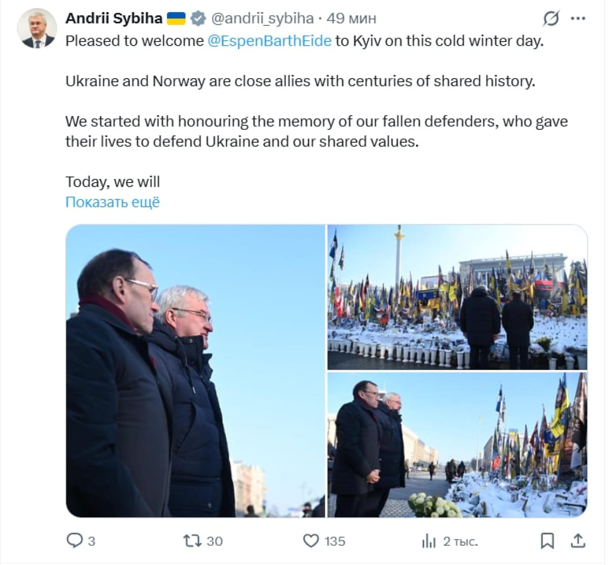 12 января в Киев прибыл министр иностранных дел Норвегии Эспен Барт Эйде. Он уже встретился со своим украинским коллегой Андреем Сибигой и почтил память погибших украинских защитников.