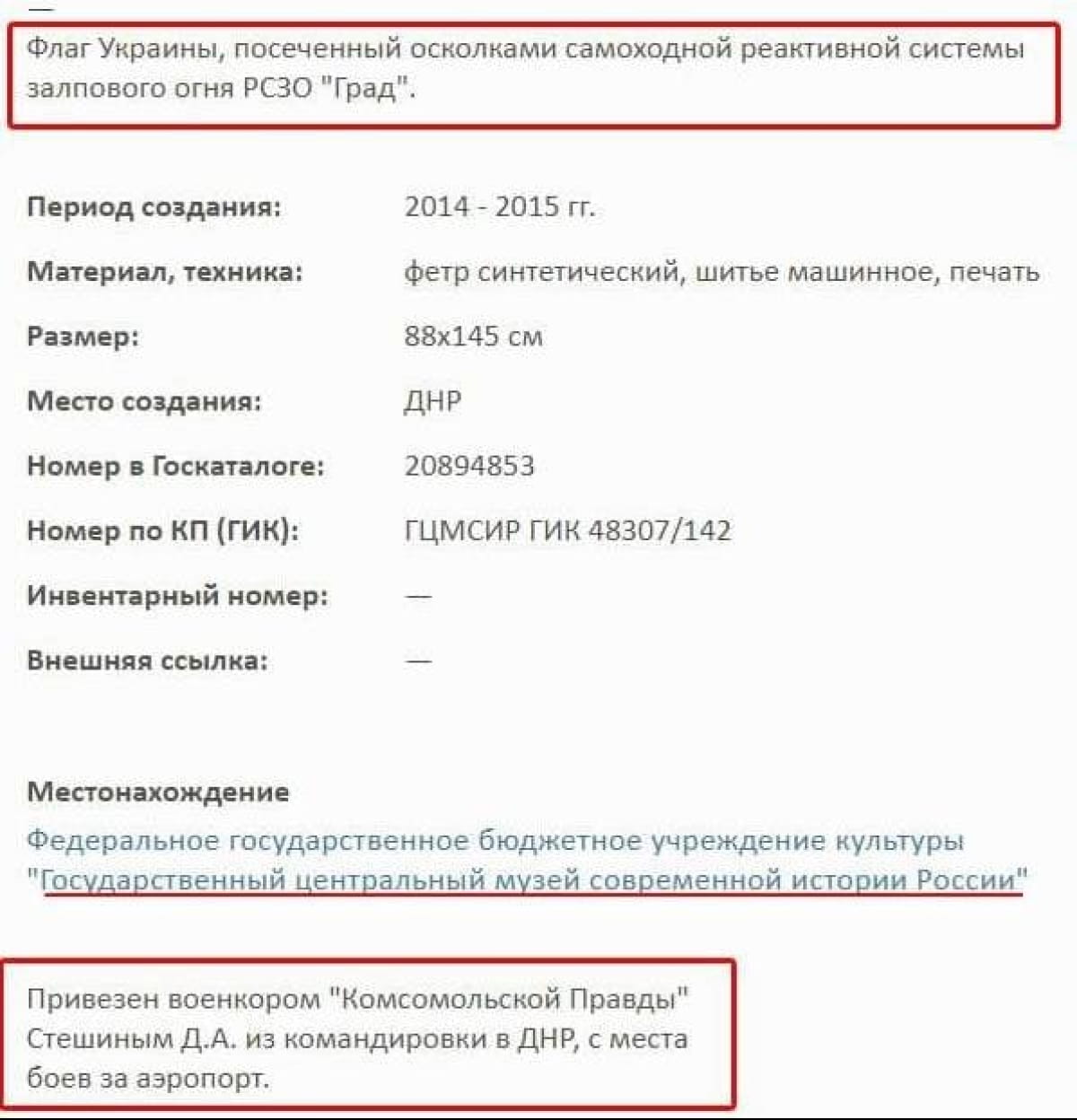 В описании из каталога говорится о том, что оба флага Украины посечены осколками самоходной реактивной системы залпового огня РСЗО "Град". Один из флагов был привезен военным корреспондентом "Комсомольской правды" Дмитрием Стешиным "из командировки в "ДНР", а именно с места боев за Донецкий аэропорт. Другой флаг в Россию доставил спецкор Федерального агентства новостей России – тоже "из командировки" в "ДНР".