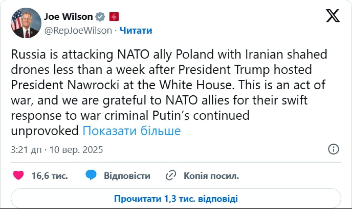 "россия атакует Польшу, союзника НАТО, иранскими беспилотниками менее чем через неделю после того, как президент Трамп принял президента Польши Навроцкого в Белом доме. Это акт войны, и мы благодарны союзникам по НАТО за их скорый ответ на продолжение неспровоцированной агрессии военного преступника путина против свободных и продуктивных стран", – отметил Уилсон.