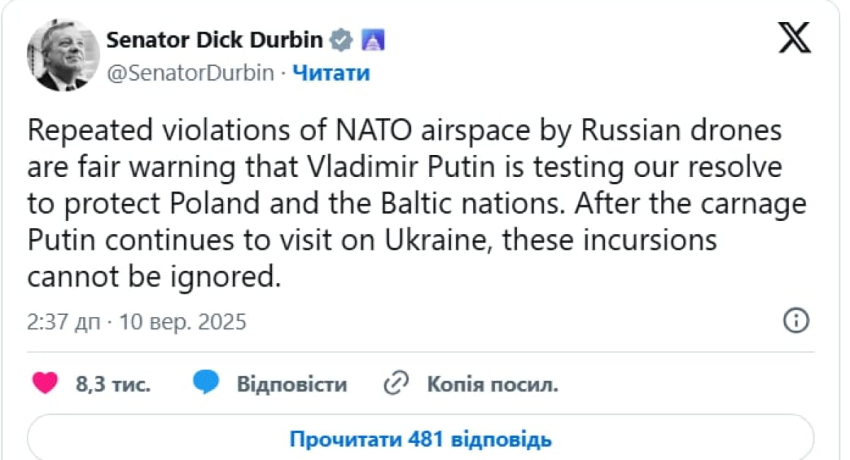 Кроме того, сенатор-демократ Дик Дурбин заявил, что "неоднократные нарушения воздушного пространства НАТО российскими беспилотниками являются четким предупреждением о том, что путин испытывает нашу решимость защитить Польшу и страны Балтии".