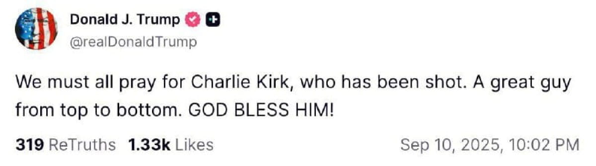 Президент США Дональд Трамп отреагировал на покушение на Чарли Кирка и призвал молиться о его жизни.