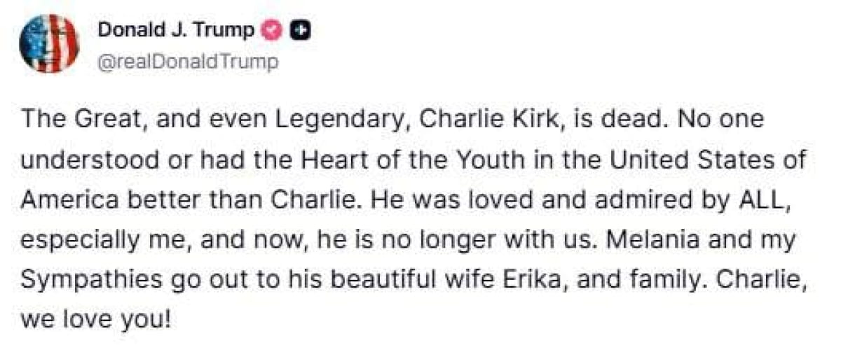 Обновлено, 23:45. Президент США Дональд Трамп подтвердил смерть Чарли Кирка.