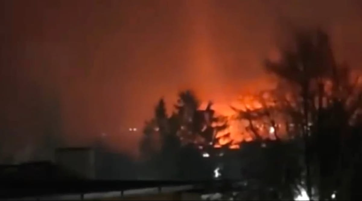 На опубликованных видео видно яркое зарево в небе и пожар в районе промышленной зоны.