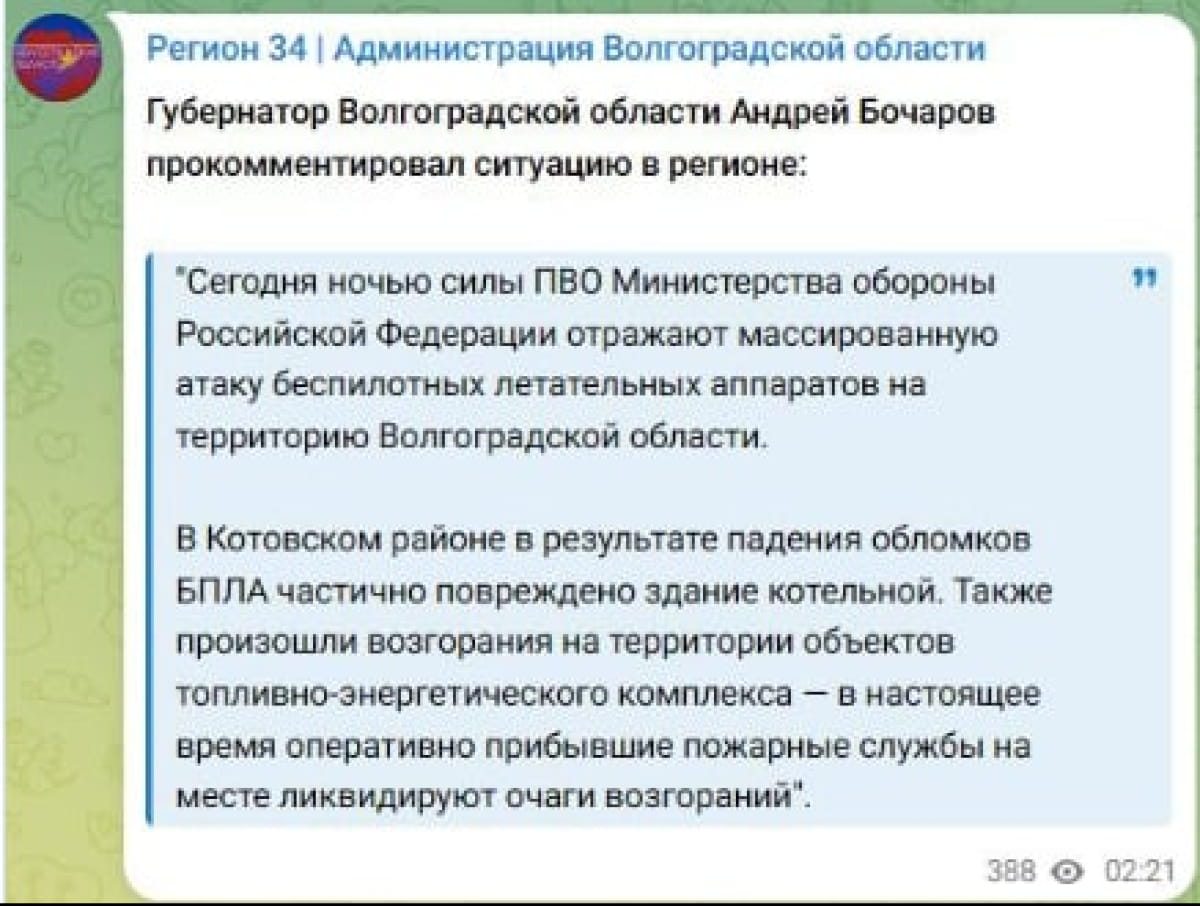 По сообщениям местных пабликов, атака дронов произошла примерно в 1:00 ночи по киевскому времени. Вскоре информацию подтвердил губернатор Волгоградской области Андрей Бочаров.