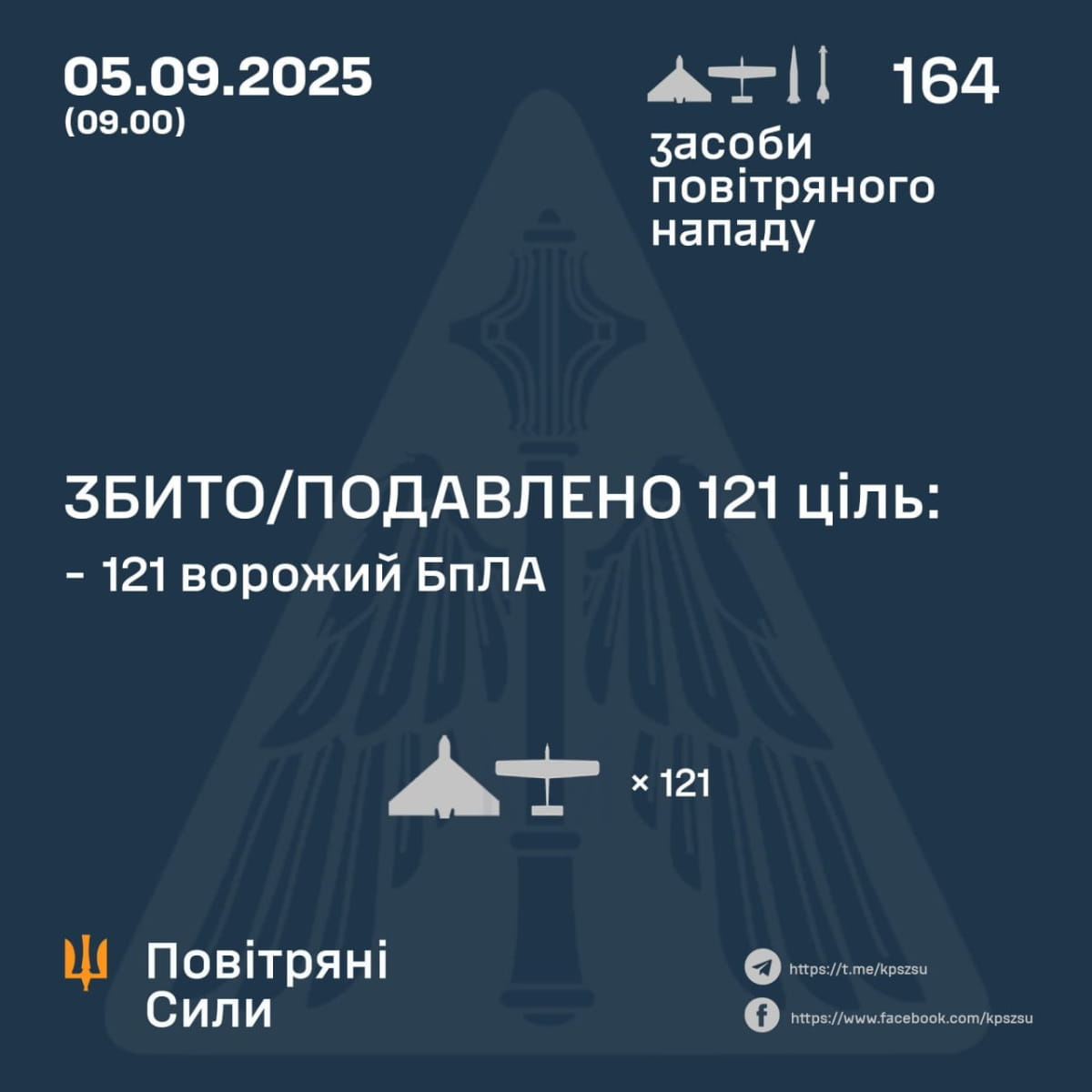 По предварительным данным, по состоянию на 09:00, противовоздушной обороной Украины сбит или подавлен 121 вражеский дрон типа Shahed и дроны-имитаторы разных типов на севере и востоке страны.