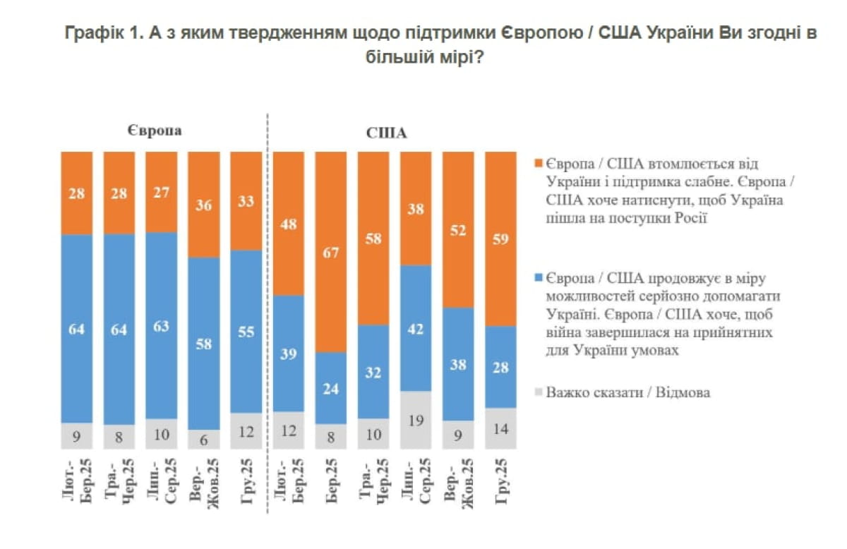 "В случае США продолжается нисходящая тенденция. По сравнению с началом октября 2025 года с 52% до 59% стало больше тех, кто считает, что США устали и давят на Украину для уступок россии. Зато с 38% до 28% стало меньше тех, кто, наоборот, продолжает считать США надежным союзником", – заявили в КМИС.