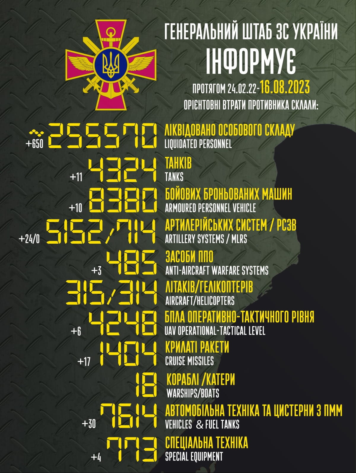 Общие боевые потери противника с 24.02.22 по 16.08.23 ориентировочно составили:
