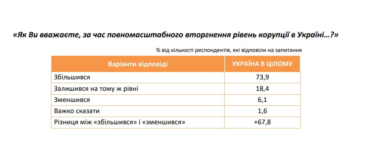 "Подавляющее большинство опрошенных жителей Украины (73,9%) считают, что за время полномасштабного вторжения уровень коррупции в Украине вырос. Значительно меньшее количество респондентов (18,4%) считают, что за время полномасштабного вторжения уровень коррупции в стране не изменился, и лишь 6,1% респондентов считают, что уровень коррупции за указанный период времени уменьшился. Такое восприятие указывает на высокий уровень общественной чувствительности к проявлениям несправедливости и злоупотреблений во время войны, когда граждане ожидают максимальной мобилизации ресурсов на оборону и не терпят даже незначительных отклонений от моральных стандартов. Рост субъективного ощущения коррупции является не только отражением реальных случаев злоупотреблений, но и результатом "медиализации" этой темы, когда коррупционные сюжеты активно тиражируются в информационном пространстве, формируя атмосферу обобщенного недоверия к властным институтам", – говорится в исследовании.