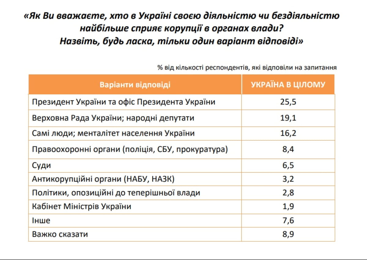"В то же время в вопросе о том, кто несет основную ответственность за коррупцию в органах власти, среди опрошенных жителей Украины нет единодушия. Чаще всего респонденты называли в первую очередь ответственными за коррупцию в органах власти президента Украины и Офис президента Украины (25,5%); Верховную Раду Украины, народных депутатов (19,1%) и самих людей, и менталитет населения Украины (16,2%). Также совокупно 18,1% опрошенных считают, что ответственность лежит на правоохранительных, антикоррупционных органах и судах. Такая структура ответов демонстрирует размытость представлений о конкретных виновниках коррупции и одновременно – персонификацию ответственности на высших уровнях власти. Это свидетельствует о кризисе институционального доверия, когда граждане воспринимают коррупцию не как отдельные злоупотребления, а как системную характеристику политического поля. Показательно, что значительная часть респондентов признает и собственное участие или толерантность к коррупционным практикам, что указывает на глубокую культурную укорененность этого явления", – отметили в исследовательском центре.