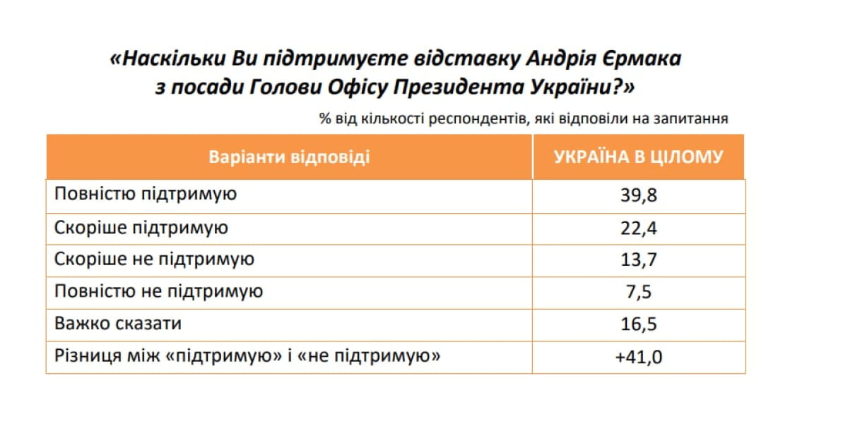 "Большинство жителей Украины (62,2%) поддерживает отставку Андрея Ермака с должности главы Офиса президента Украины. Не поддерживают отставку Андрея Ермака 21,2% опрошенных, а 16,5% респондентов не определились с ответом на этот вопрос", – отмечается в исследовании.