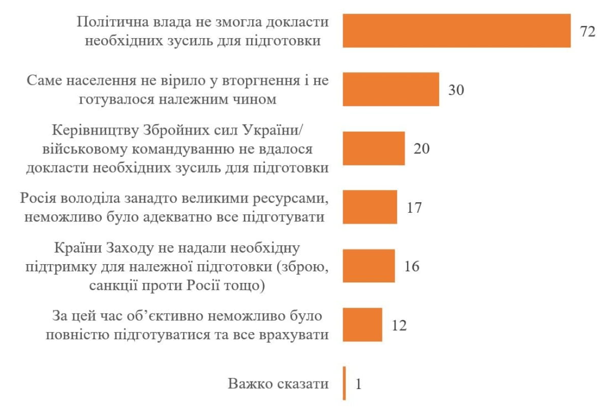 "Зачастую респонденты всеукраинских опросов говорили о том, что политическим властям не удалось приложить необходимых усилий (41% среди тех, кто считает, что Украина не была готова), и что само население не верило и не готовилось (32%). Кроме того, украинцы называют причинами влияние пророссийских сил и агентов (21%), недостаточную поддержку Запада (16%), а также то, что россия обладала слишком большими ресурсами (15%). Реже респонденты выбирали ответ, что военное командование не смогло приложить должное усилие (13%), и что за этот период объективно невозможно подготовиться и все учесть (10%)", – говорится в пресс-релизе КМИС.