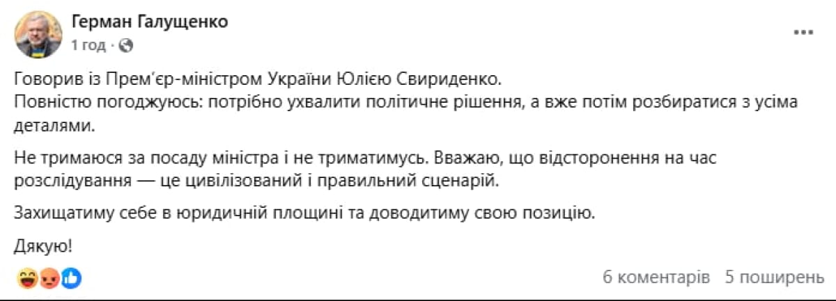 Галущенко сделал заявлениеСкриншот из соцсетей