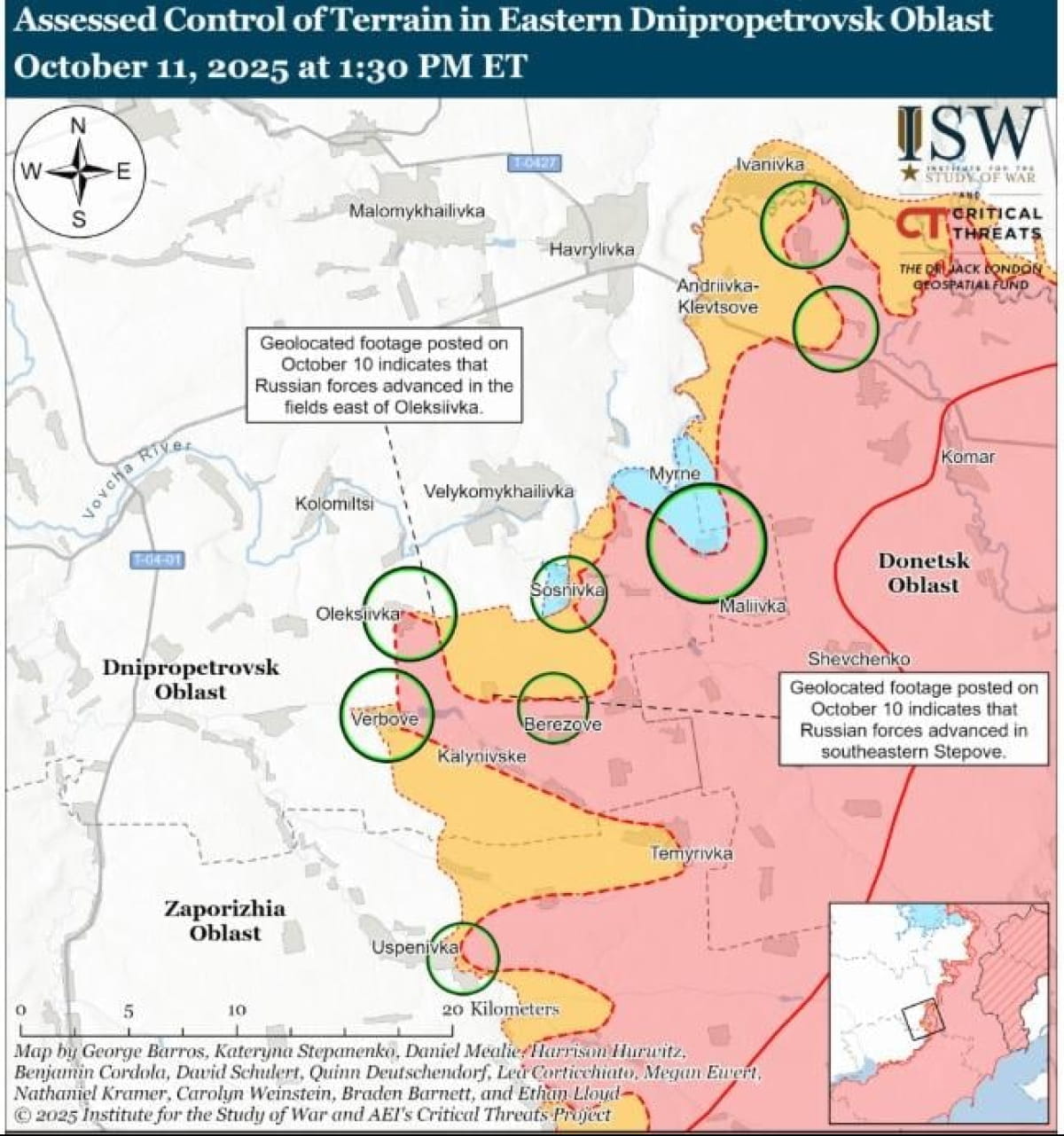 По данным Института изучения войны (ISW), в Днепропетровской области российские оккупанты смогли продвинуться на Алексеевском направлении. Геолокационные видеозаписи свидетельствуют о продвижении врага в юго-восточной части села Степное и восточнее населенного пункта Алексеевка.