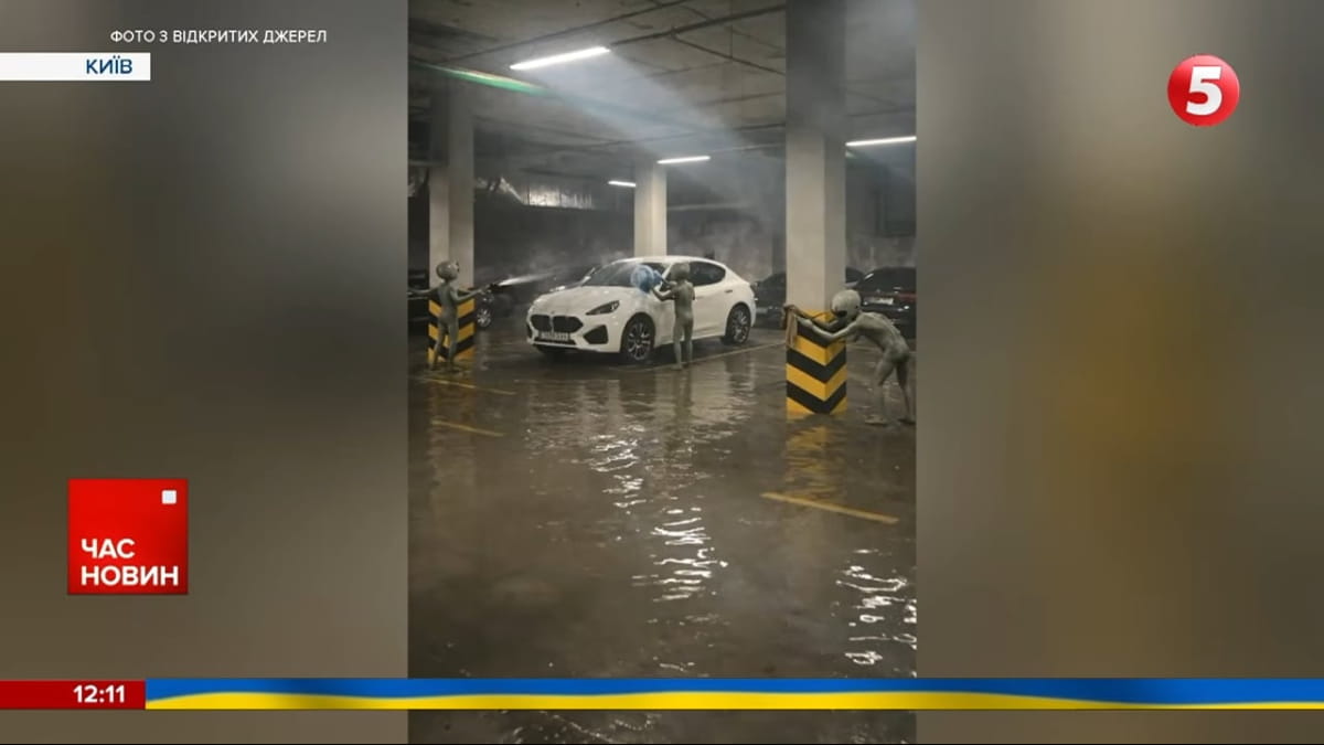 Даже в самой сложной ситуации украинцы стараются не терять чувства юмора. Киевляне создают мемы о затопленных домах. С юмором к проблеме подошли и жители жилого комплекса в Голосеевском районе. С помощью искусственного интеллекта они превратили затопленный паркинг в бассейн, а автомобили в объекты фантазий, где их якобы моют инопланетяне.