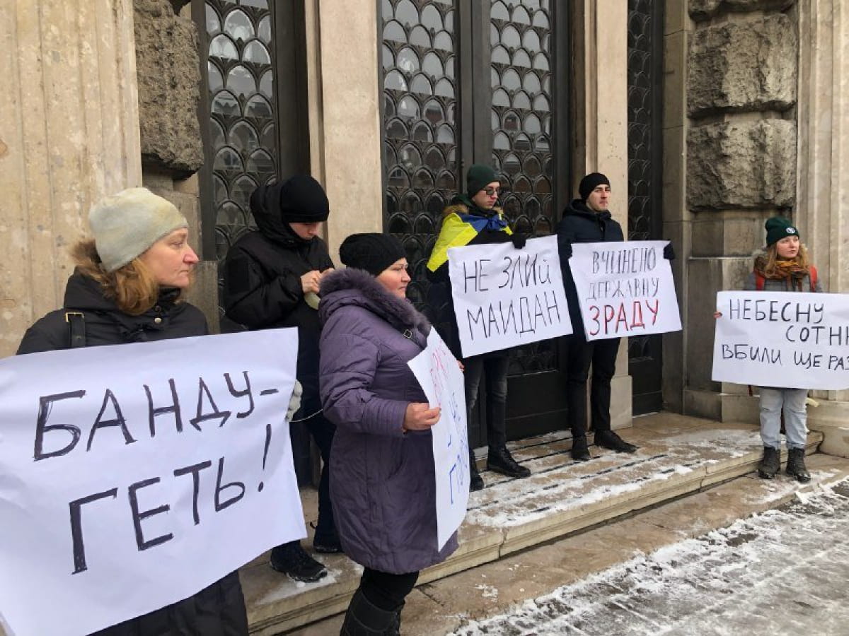 К акции присоединилось больше людей. Ее продолжили под стенами Львовской областной прокуратуры. На входе в здание наклеили плакаты "Не слей Майдан", "Беркутня – не пленные", "Небесную Сотню убили вновь".