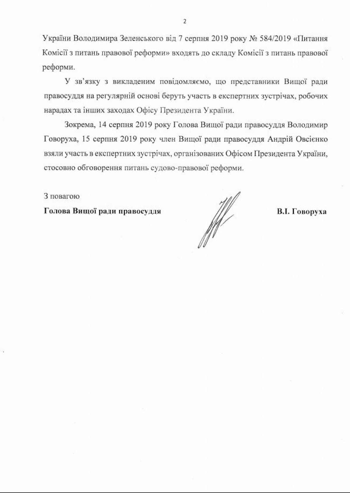 "14 августа 2019 года Председатель Высшего совета правосудия Владимир Говоруха, 15 августа 2019 года член Высшего совета правосудия Андрей Овсиенко приняли участие в экспертных встречах, организованных Офисом президента Украины относительно обсуждения вопросов судебно-правовой реформы. С уважением Председатель Высшего совета правосудия В.И. Говоруха".
