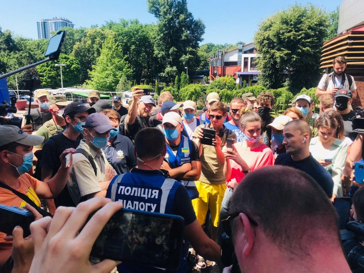 Спор продолжался некоторое время. Вокруг полицейских толпой собралась группа поддержки Стерненко. Они наблюдали за действиями как журналистов, так и копов. Впрочем, через некоторое время вернулись наблюдать за трансляцией из суда. Журналисты – так и остались в кольце полицейских.