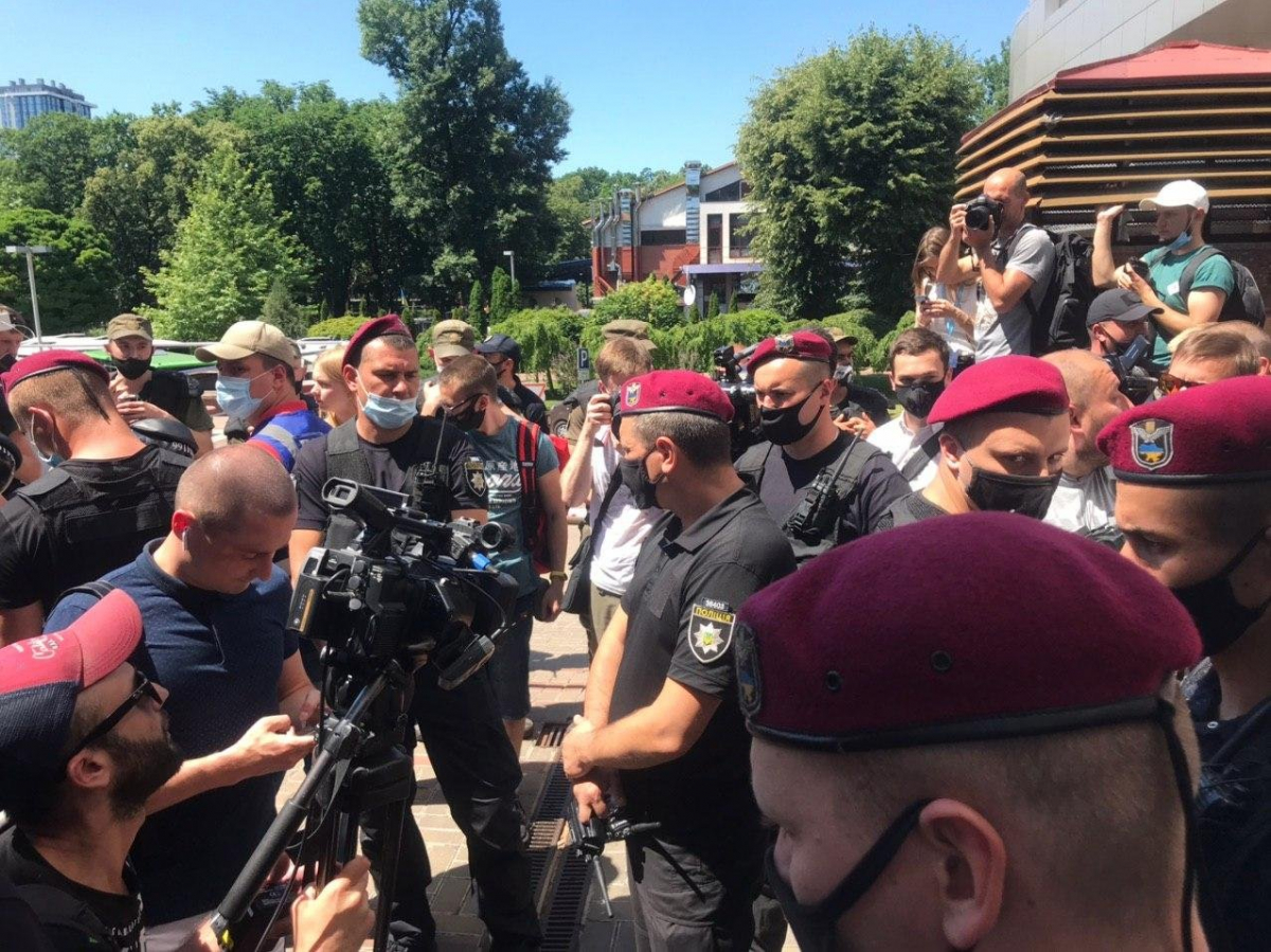 Под стенами здания – акция в поддержку Стерненко. Ее участники собирают заявления от желающих взять активиста на поруки. У активистов возник спор с журналистами канала Медведчука.
