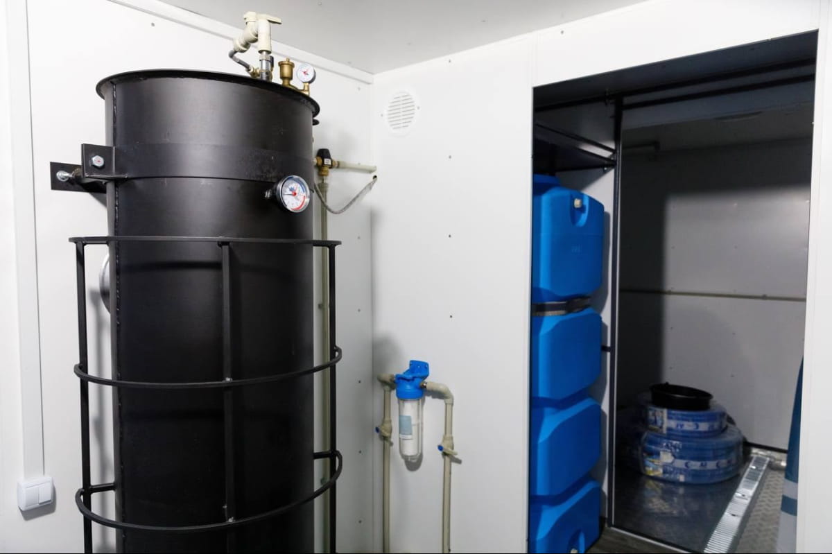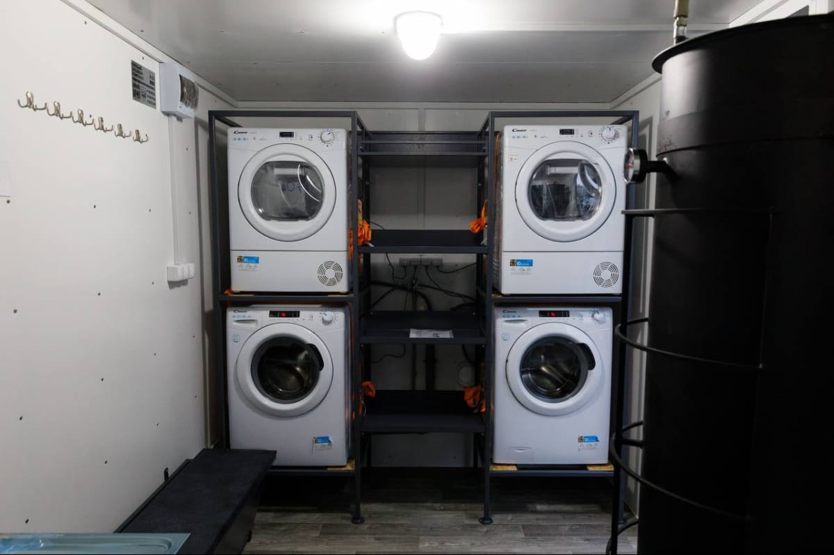 Фонд Порошенко совместно с волонтерами с начала полномасштабного вторжения производит и передает на фронт стирально-душевые комплексы, чтобы обеспечить комфортные условия для военных, которые выходят на короткий отдых с передовой. В специально оборудованных вагончиках установлены душевые, а также две стиральные и две сушильные машины. Вода греется на твердом топливе за 20 минут до 40 градусов, также есть генератор для электроприборов. Такой «вагончик» можно подвезти в удобное для военных место.