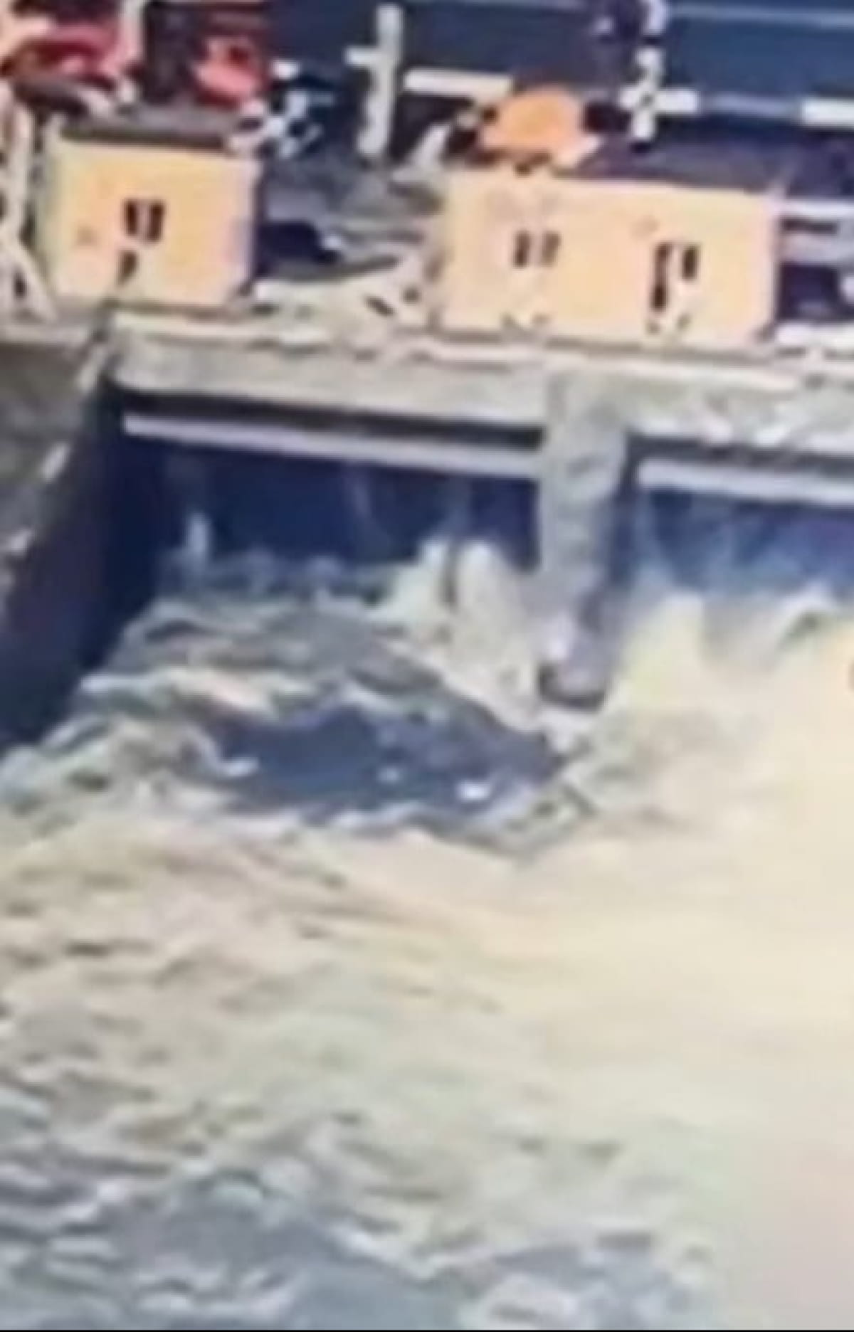 На видео видны значительные повреждения гидросооружения и мощный поток прорывающейся через дамбу воды.
