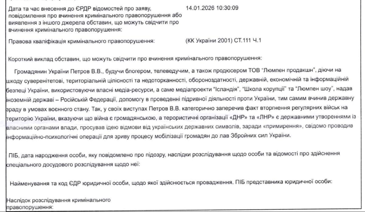 "Гражданин Украины Петров В.В., будучи блогером, телеведущим, а также продюсером ООО "Люмпен продакшн", действуя в ущерб суверенитету, территориальной целостности и неприкосновенности, обороноспособности, государственной, экономической и информационной безопасности Украины, используя собственные медиа-ресурсы, а именно медиапроекты "Исландия", "Школа коррупции" и "Люмпен шоу", оказал иностранному государству – рф, помощь в проведении подрывной деятельности против Украины, тем самым совершил государственную измену в условиях военного положения", – говорится в сообщении.