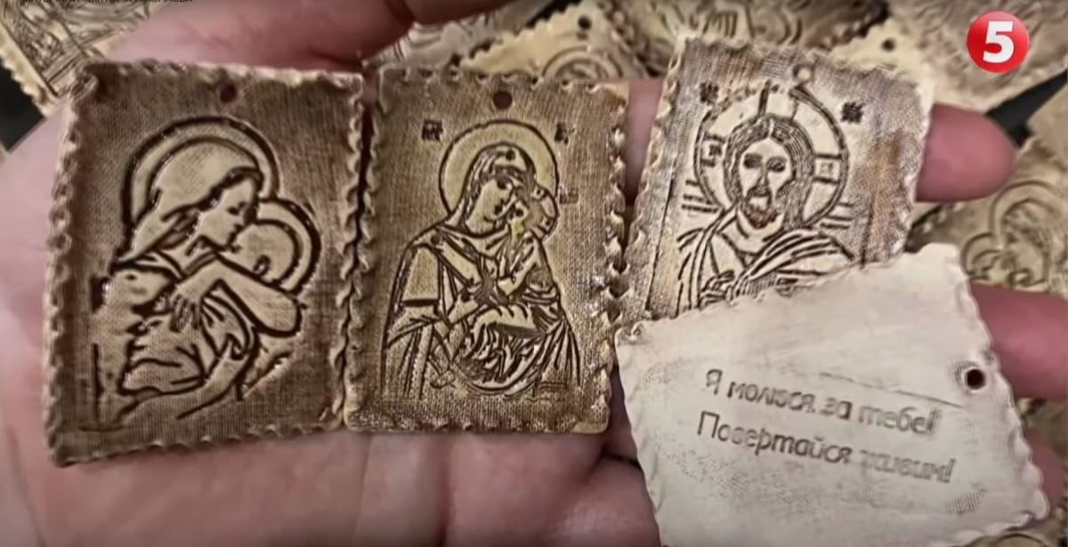 Всего с апреля Виктория передала на фронт 1200 икон. Из оставшейся глины мастерица изготавливает патриотические значки с надписями.