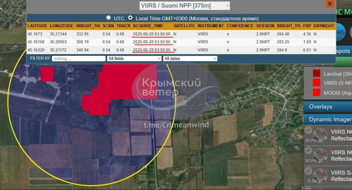 "Прилет был мощный. О сильном пожаре на аэродроме, дым от которого был виден утром, сообщают наши подписчики из сел Красносельское, Яркое Поле, Трудолюбовка и поселка Кировское", – отметили там.
