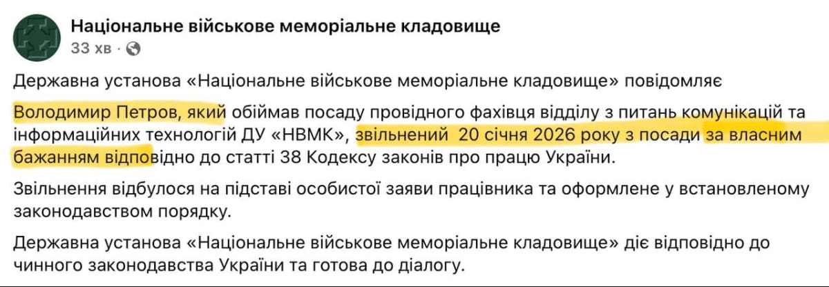 Министерство по делам ветеранов Украины проводит служебное расследование руководства ГУ "Национальное военное мемориальное кладбище" (НВМК). Речь идет, в частности, о возможном неправомерном бронировании. На этом фоне был уволен Петров.