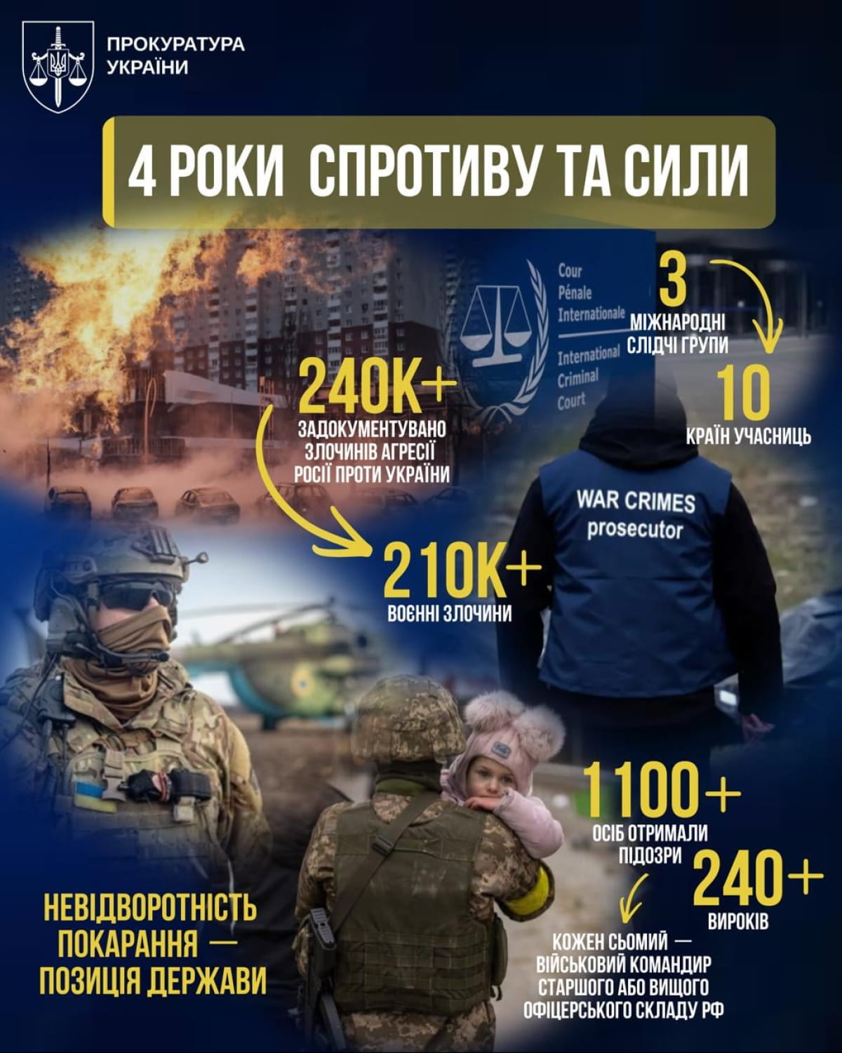 За четыре года полномасштабного вторжения правоохранительные органы задокументировали более 240 тысяч преступлений агрессии рф против Украины, из них более 210 тысяч – военные преступления. Об этом сообщает генеральный прокурор Украины Руслан Кравченко.