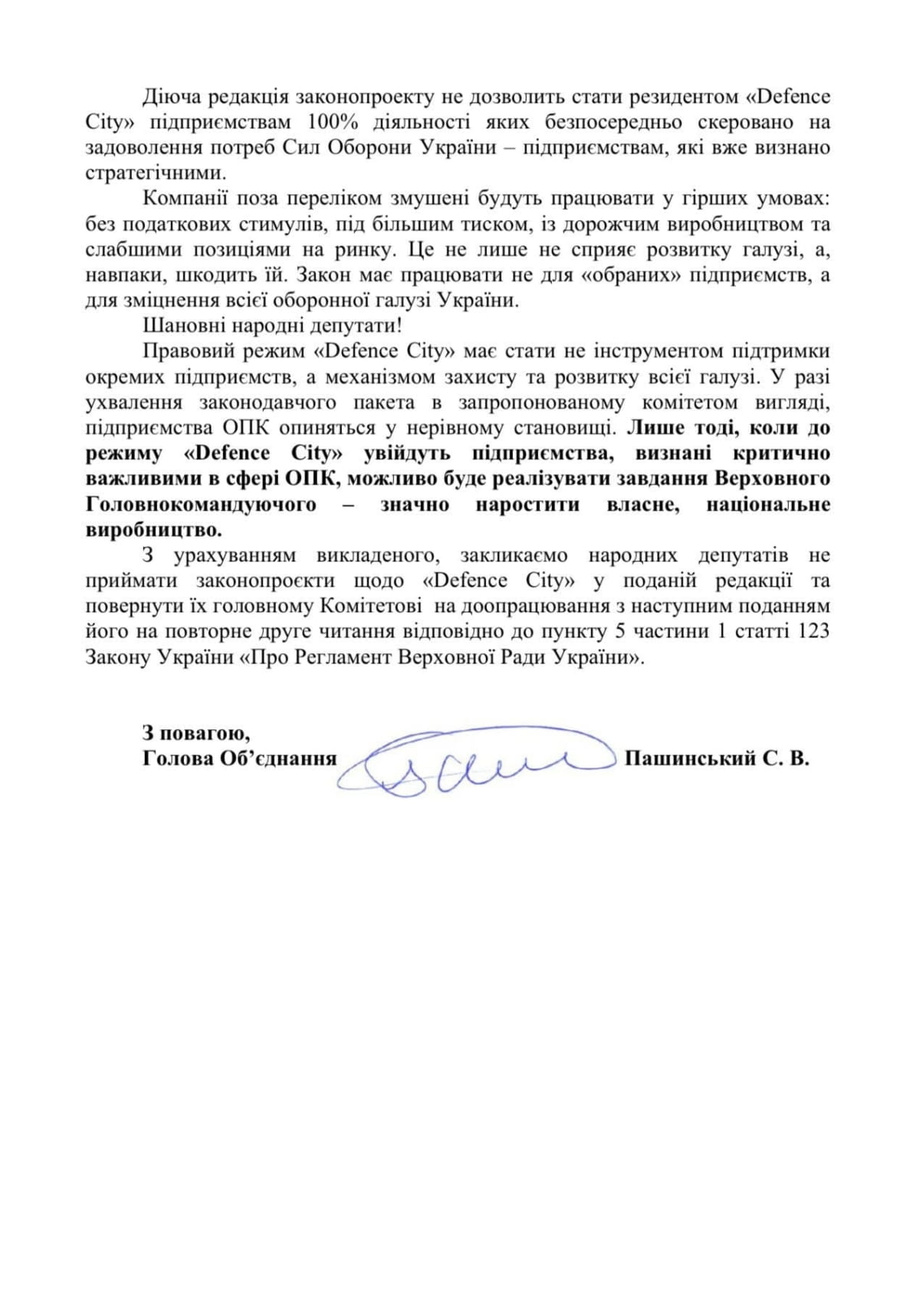 "Действующая редакция законопроекта не позволит стать резидентом Defence City предприятиям, 100% деятельности которых напрямую направлены на удовлетворение потребностей Сил обороны Украины – предприятиям, которые уже признаны стратегическими. Компании вне перечня вынуждены будут работать в худших условиях: без налоговых стимулов, под большим давлением, с более дорогим производством и более слабыми позициями на рынке. Это не только не способствует развитию отрасли, но, напротив, вредит ей. Закон должен работать не для "избранных" предприятий, а для укрепления всей оборонной отрасли Украины", – указывается в заявлении оборонно-промышленной ассоциации.