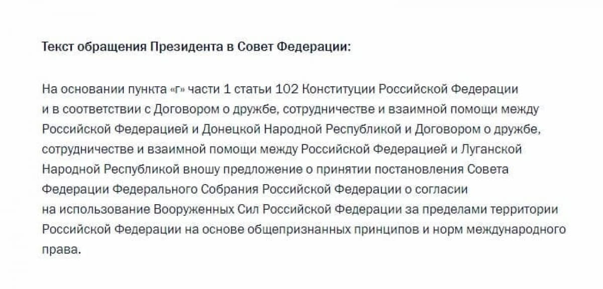 Разрешение на использование войск за границей России касается именно официального ввода войск на территорию так называемых ДНР и ЛНР, которые Россия вчера признала официально.
