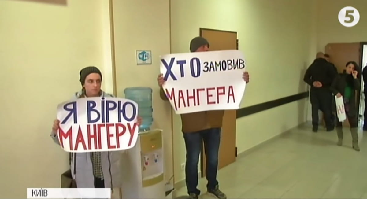 К зданию суда пришли люди с плакатами в поддержку Мангера. Некоторые из них приехали даже из Одессы. На вопрос журналистов, в чем обвиняли Мангера и кто такая Екатерина Гандзюк, одна из протестующих не смогла ответить.