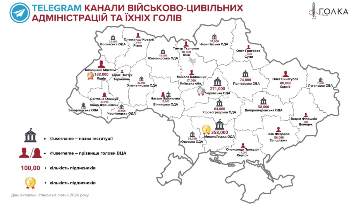 12 Telegram-каналов глав областных военно-гражданских администраций персонализированы, и это может повлиять на голосование во время послевоенных выборов. Об этом говорится в новом исследовании общественной инициативы "Голка".