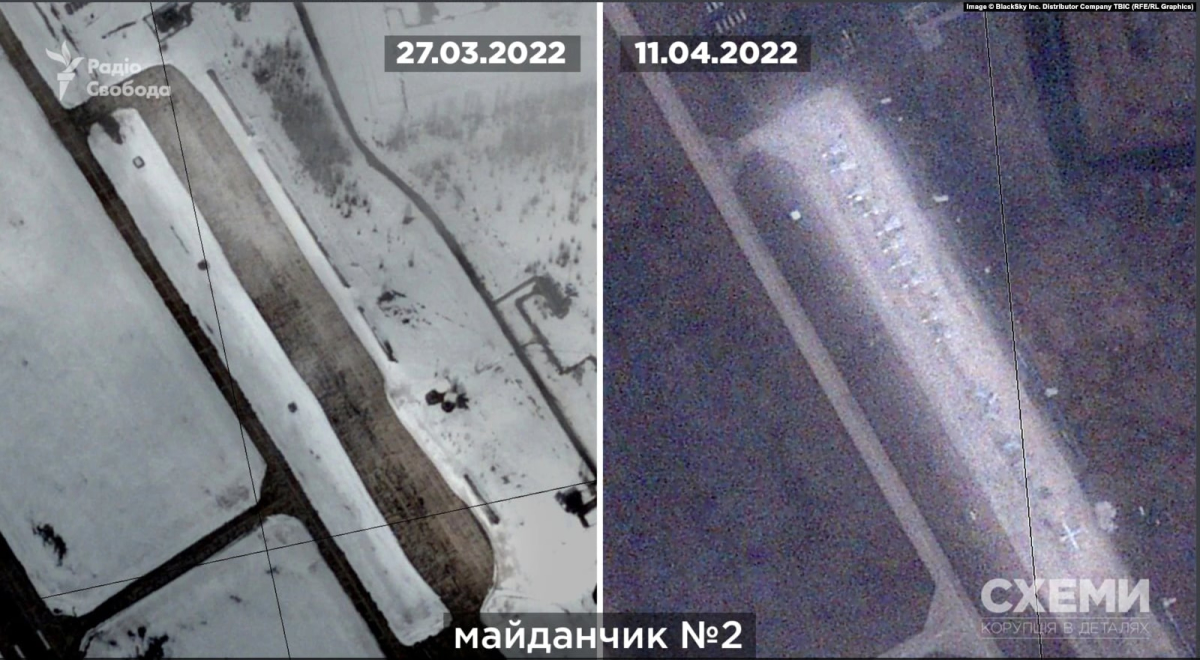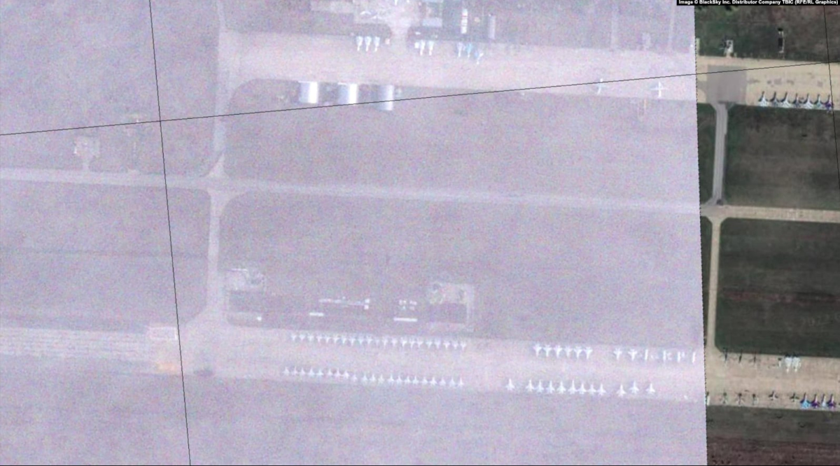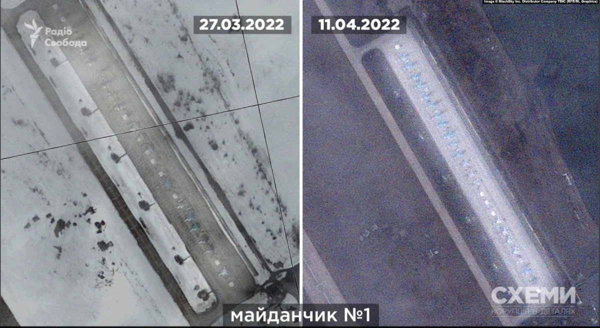 По сравнению со снимком от 27 марта, на этой части аэродрома количество самолетов увеличилось вдвое. С помощью военных экспертов удалось распознать 10 истребителей Су-27 и 6 истребителей типа Су-25, сообщают "Схемы".