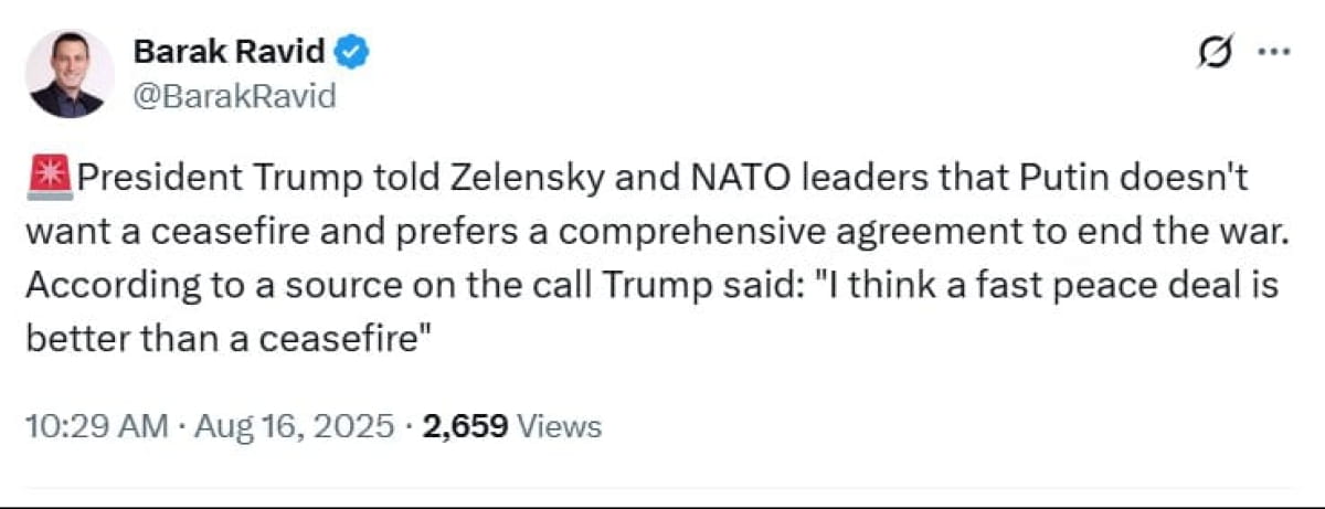 Трамп отметил: "Я считаю, что скорейшее заключение мирного соглашения лучше, чем перемирие". Об этом сообщил корреспондент издания Axios Барак Равид со ссылкой на одного из участников разговора.