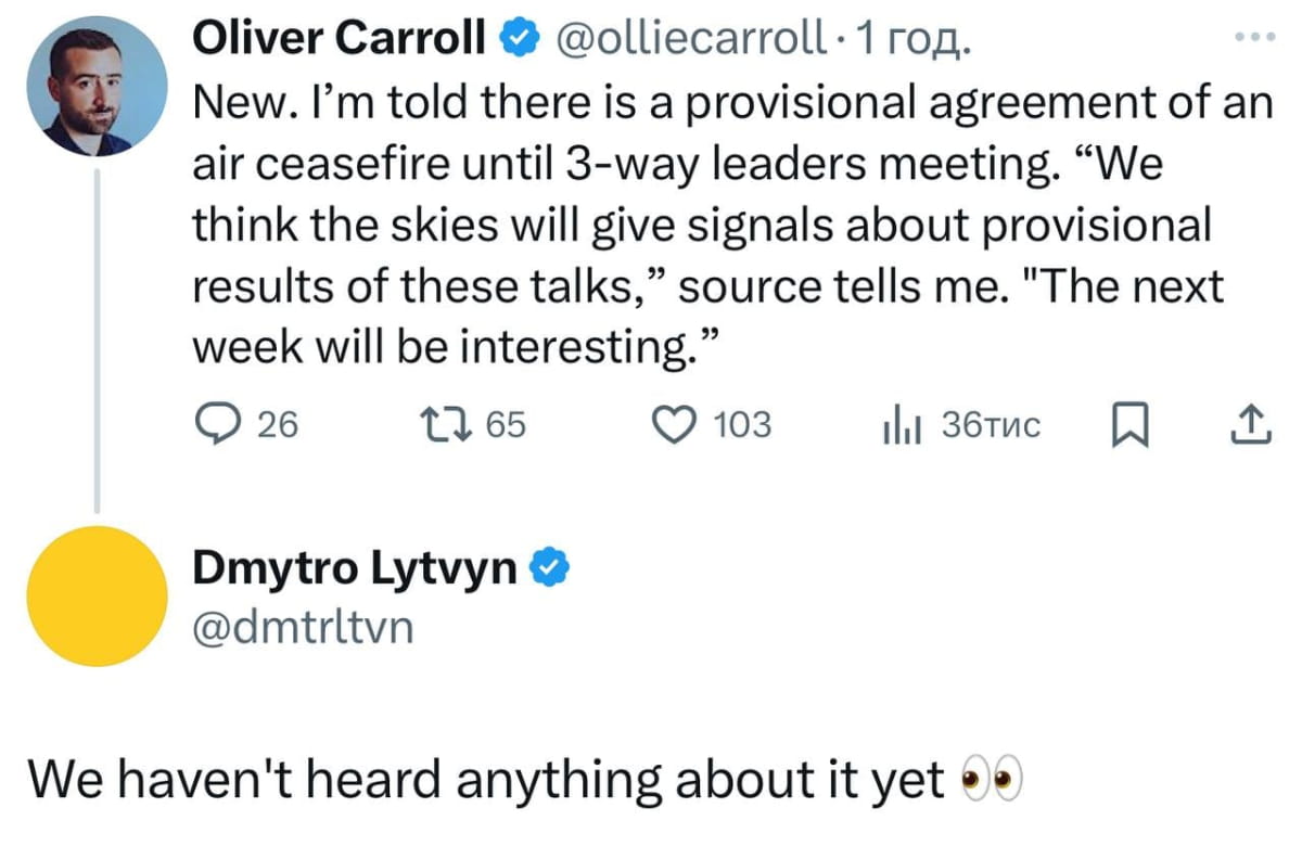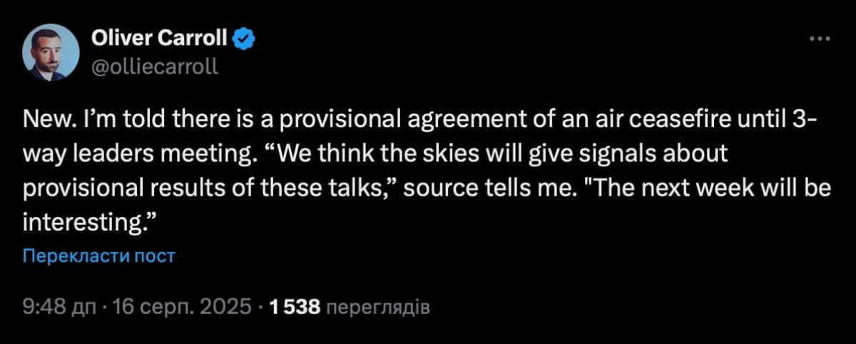 Корреспондент The Economist Оливер Кэррол сообщил, что во время саммита Трампа и путина, вероятно, была достигнута предварительная договоренность о "воздушном перемирии". Об этом он сообщил в сети X.