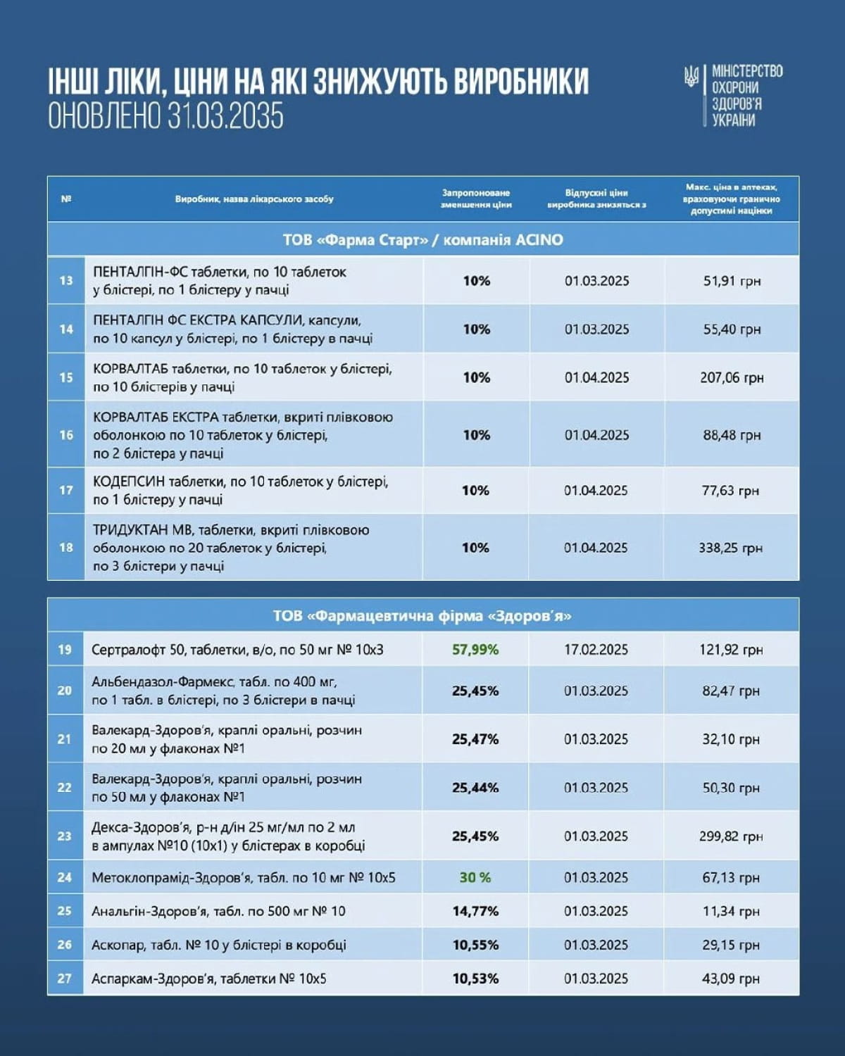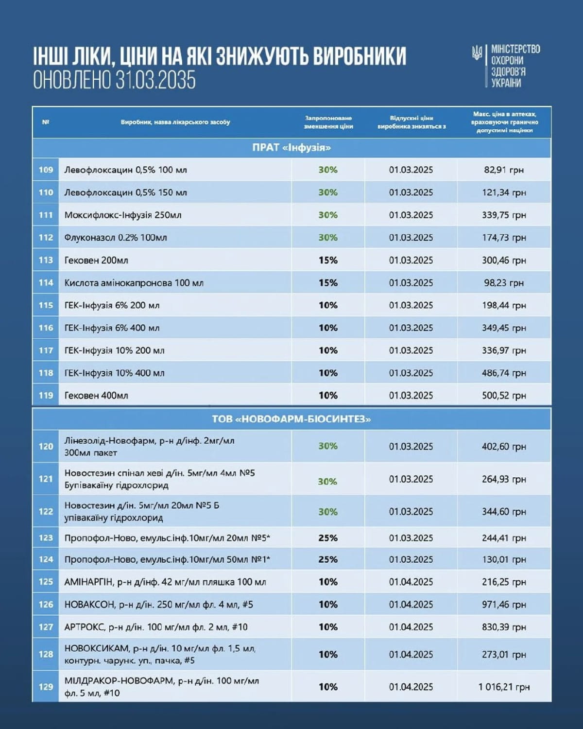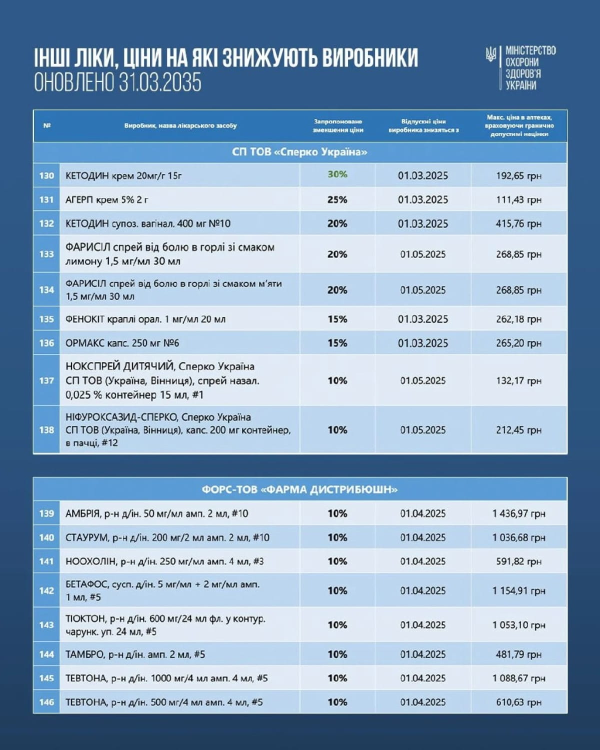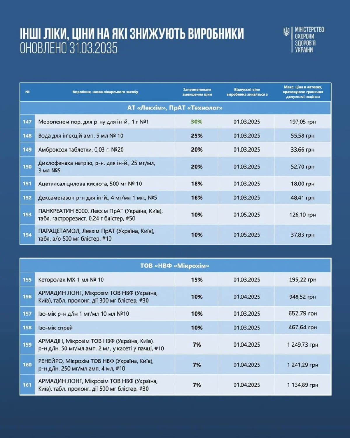 "По итогам переговоров с украинскими производителями, нам удалось достичь договоренностей по снижению цен еще более чем на 200 лекарственных средств. На половину из них цены уже снижены, что касается остальных препаратов – снижение начнется в течение апреля", – рассказал Ляшко.