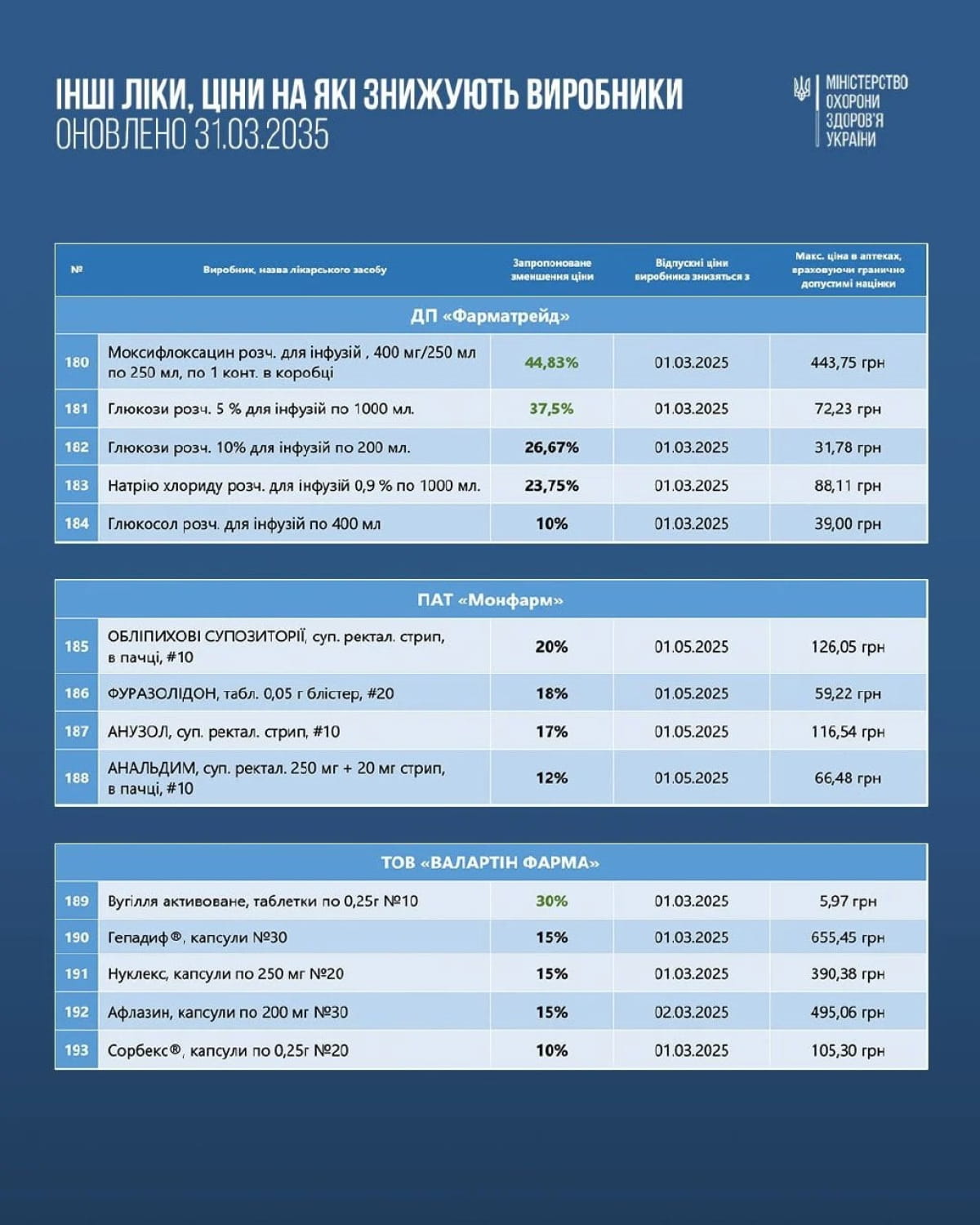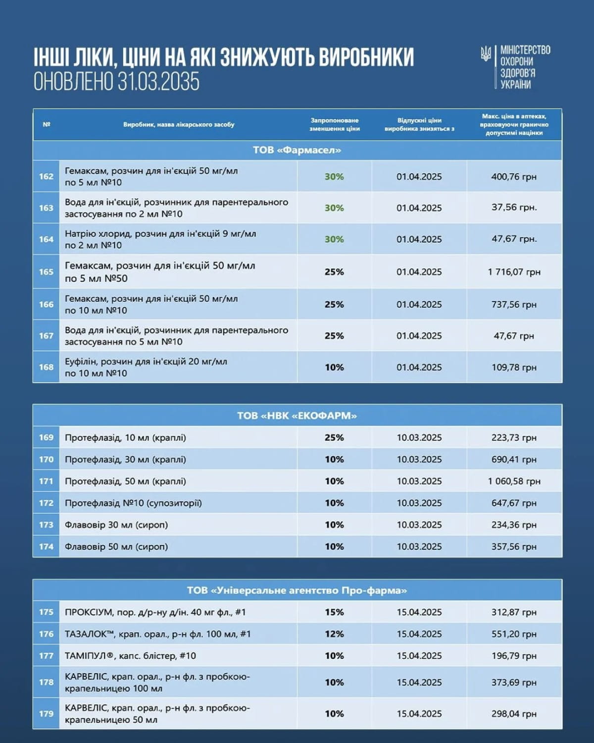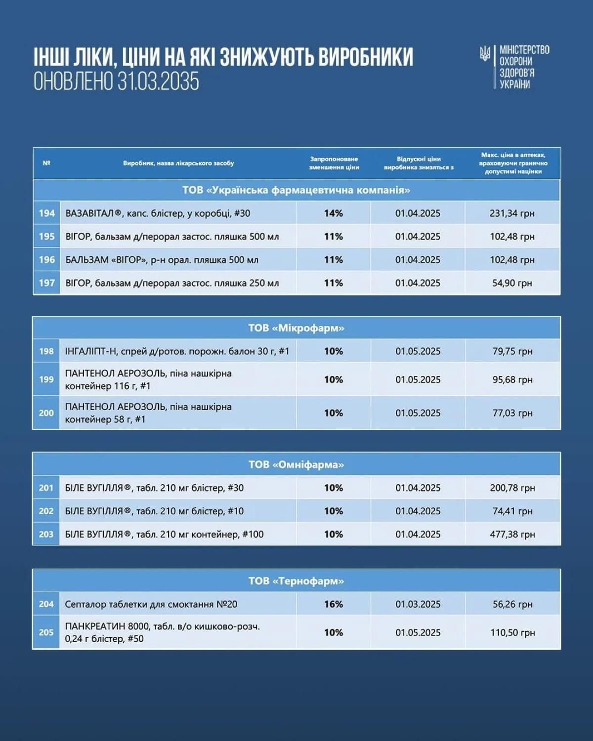 "По итогам переговоров с украинскими производителями, нам удалось достичь договоренностей по снижению цен еще более чем на 200 лекарственных средств. На половину из них цены уже снижены, что касается остальных препаратов – снижение начнется в течение апреля", – рассказал Ляшко.