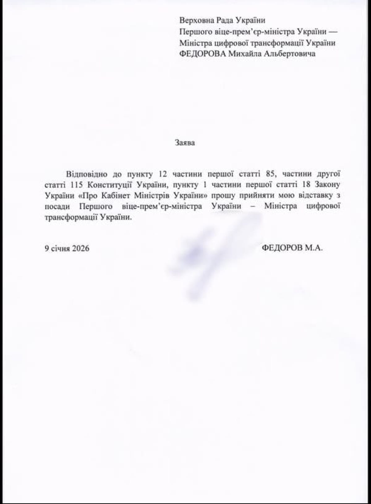 В Верховную Раду Украины поступили заявления об отставке первого вице-премьер-министра – министра цифровой трансформации Михаила Федорова и министра обороны Украины Дениса Шмыгаля. Об этом сообщил председатель парламента Руслан Стефанчук в Facebook.