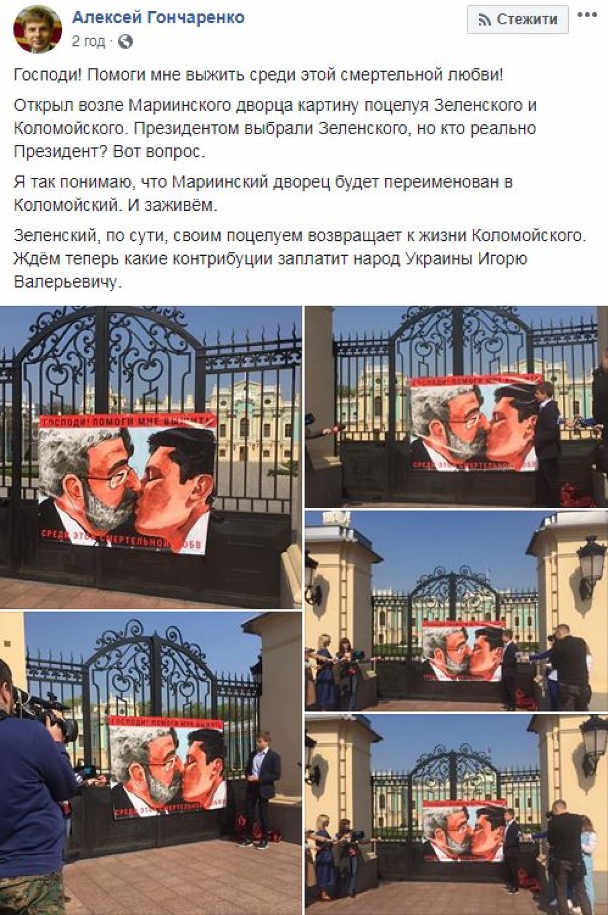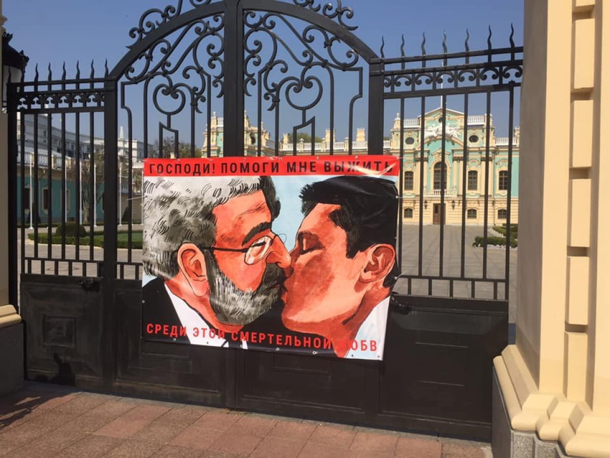 Народный депутат от БПП Алексей Гончаренко разместил на воротах Мариинского дворца плакат, где изображено, как кандидат в президенты Владимир Зеленский целуется с олигархом Игорем Коломойским. Соответствующие фотографии депутат опубликовал у себя в Facebook.
